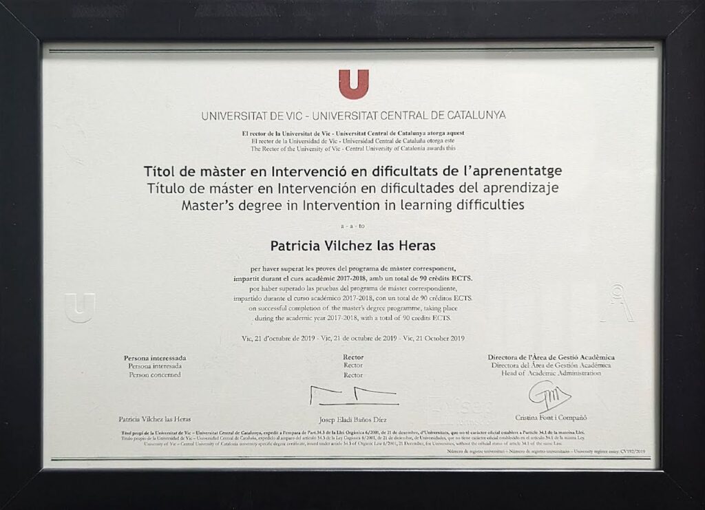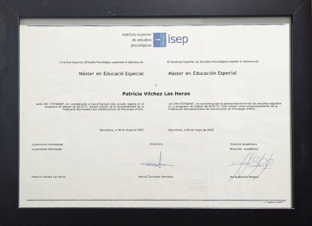 - Máster en Intervención en Dificultades de Aprendizaje, en Educación Especial e Intervención Psicopedagógica en contexto educativo, ISEP, 2018