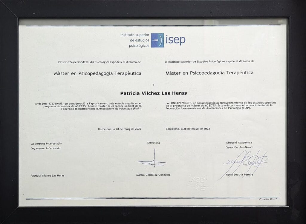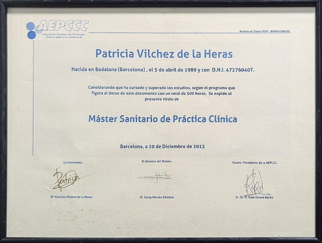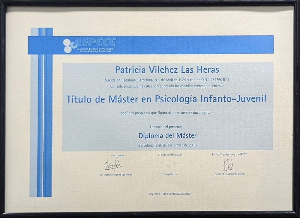 - Máster en Psicología Infantil y Adolescente, AEPCCC, 2015